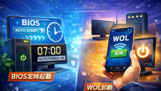 PCの前に行かずに電源を入れる方法を解説。BIOS定時起動とWake on LAN(WOL)の設定手順、メリット・注意点を説明